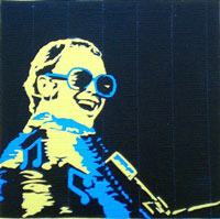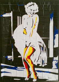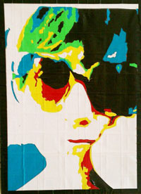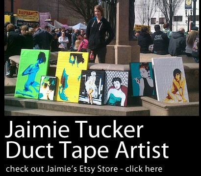 I'm a 26 year old artist from Portland, OR, currently residing in Pensacola, FL. I've been making duct tape art since I was young, but the inspiration to make duct tape canvases is a relatively new thing for me. I've been active in the Pensacola art community, a factor that greatly influences my artwork. Lately, Ive been creating pop-art inspired celebrity portraits, as well as work inspired by my home on the Gulf of Mexico. I've lately been featured in Pensacola's Gallery Night, as well as galleries in Oregon and Missouri. The photo on e left was taken at Portland Saturday Market in Portland, Oregon. I'm the girl in the fountain, the stuff in front is my artwork. While I generally appreciate duct tape more for its artistic merit, I'm not afraid to say I've used strips off my pieces during emergencies to fix shoes, hold up pants, and, once, to make a device to break into my truck after I left the keys on the dash... Duct tape is an art and an ethos. - Jaimie Tucker |
