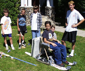 | Duct Tape Everglades Cruiser As program director for a church camp, Arthur Manning of St. Paul, Minnesota, arranged to have duct tape games for our morning activity. Each group of about six campers (ages 9-12) was given a pile of junk - wood scraps, logs, basketball, empty pop cans, chair and duct tape - and encouraged to assemble anything they so desired, with the stipulation that they could add other items as long as there was no permanent damage done to them. This kept the kids busy for at least an hour, and they came up with fairly creative objects. The winner was a space-age looking vehicle (a chair mounted on waterskis). The inventors are shown in the lower photo. Great job guys! Looks like an Everglades Cruiser to us! ---Jim and Tim |