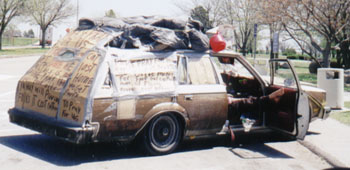 | The Family Ductster "Dick" from Vail, CO, sent us this one. He caught this shot on I-70 Eastbound on April 29, 1998. "As we watched from the safety of our own vehicle, the driver got out a roll of duct tape and patched up some of the loose ends. The whole machine appeared to be held together with Duct Tape!" CHECK OUR DUCT TAPE BODY SHOP. |
