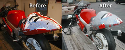 Motorcycle Repair, or Really Cool Customizing Job? I obliterated the back of my GSXR 600 at New Hampshire International Raceway. New levers, temporary subframe fix, 20 feet of duct tape. Back on the track 20 minutes later. Better than new. - Jim L., Stafford Springs, CT