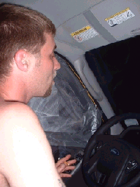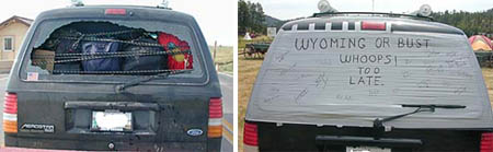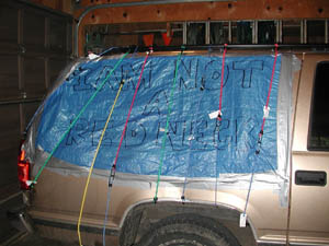 Tow Rope on a Roll Back in the seventies my brother Gary Bowling used four rolls of duct tape to tow a '64 Nova stationwagon over 18 miles of curving mountain roads up by Paines Creek in Tehama county, Callifornia. Two rolls were twisted and twined between a '58 Wilys pickup and a tire and two more rolls were twisted and twined between the tire and the Nova. They did it this way because the Nova had no brakes so the tire was to cushion the bummpers. My brother said they drove slowly but that the duct tape held up like a champ. my brother also feels that every applicant for citizenship should be required to own and know how to operate duct tape. Thanks guys for a great site! - Sharon Brown Van Gremlins On Friday 13th my wife came home very upset. She said our van had gremlins. It seems that our van decided to start locking and unlocking the doors, the inside lights were flashing, the door ajar light was going on and off, and the damn thing was dinging also....CONTINUOUSLY, while the car was in motion. Not a Redneck After another day or two, the weather warmed up enough and I was well enough to get the vehicle to a body shop. They said no way could they fix it before I had to drive home to Tennessee. That's when I designed and executed the temporary, albeit completely opaque, window you see in the pic. The duct tape securely held all the way back to Tennessee, through rain, snow, freezing temperatures, and highway speeds, and for another week or so until I could make arrangements to have the repair done. The guys at the repair shop loved the temporary repair job, especially the caption I wrote on the tarp. - Karen D., Nashville, TN
