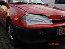 Fender Sling My Uncle Kevin and I were out in his baja bug playing in the mud hole. When we decided it was time to go, we came ripping out of the hole and rolled the bug. Not to worry about us, roll cage and all. But the fiberglass front end had torn from one fender across the hood, so that one side was in danger of being grabbed by a tire. So Kevin got the roll of duct tape out and fashioned a sort of sling for the fender and then finished off by taping the seams down. Overall it looked pretty sad but we made it home. I got my first lesson in duct tape repair that day and have used it countless times since. -Roger M. Works on Airplanes, too! Was a working pilot, in a Piper Super Cruiser, and taxiing around a tight crowded ramp at a small airport. Had been flying 8 hours that day already, and just needed to refuel, and I could fly home and call it a day. Well, as I turned a corner, I saw someone had parked their plane blocking the taxiway. With no room to stop, I had to swerve my plane towards a small gap Tire Repair Four friends and I went on a hunting trip. Before daylight, I ran over someone's hunting stand in the road and blew out my tire. We put on the spare and went hunting. That evening, we moved to a new spot and heard some air leaking. There was a stick in spare tire we had just put on. We were fifty miles from town and no new tires. We looked in our tool boxes to see what we could fix the leak with. I found a roll of duct tape. My friends laughed and said, "You can't fix a tire with duct tape!" Then I started thinking... I rolled up a little plug out of a strip of duct tape about ten inches long (sticky-side out). I jammed the plug into the hole with a screwdriver and melted the tape with a lighter and used the screwdriver to spread the molten tape around the outside of the hole. Using a 12 volt air compressor, we aired up the tire and it held all night and fifty miles back to town. The guys at the repair shop were totally impressed with our duct tape repair job! --- Jacob C. Upholstery Fix (or not?) About 7 years ago, I bought a car that had a rip on the side of the driver's seat back. No problem! I had duct tape! So I just taped over the rip. I was so proud! It was all fine and good until summer came. Then, slowly, I noticed that there was some sort of strange goo on the floor (and on anything that was ON the floor) of my car. I couldn't figure it out until, finally, enough of the adhesive from the duct tape melted, that I realized it was coming from the duct tape! What a mess!!! I do NOT recommend using duct tape to fix the upholstery in your car!! --- Genevieve B., Loveland, CO Headliner Repair I have a Mercury Grand Marq, and the headliner was coming down by the rear window so i took it to a place that does head liner's and seat cover's to see if they could fix it. The Man said they all do that but it can't be fixed, I would have to get a new head liner installed for $485.00 so I went home and looked at it and around the rear window was a 2 inch black border around the top of the window, so I used black duct tape and it worked, the border hides the tape and it looks like it belongs there. My 17 year old son was amazed he couldn' believe it he said boy Dad that duck tape fixes anything that's great stuff, and I told him the whole world is held together by DUCT TAPE. --- Robert F. S. Headlight Repair About a year ago my girlfriend and I were taking a road trip to Ohio. (from Toronto Canada). She was advised that her car should be in top shape for this (as police might pull her over if something was wrong). Some time before she had lost the use of one headlamp, the bulb had come lose and partly melted the reflector/housing. It was decided that this needed to be fixed.