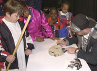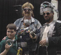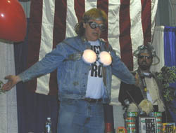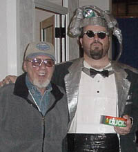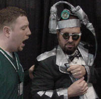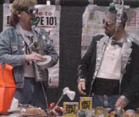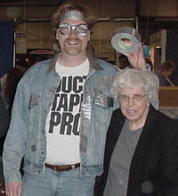 (right) Tim holds the duct tape roll in the sainting position over the head of a lovely duct tape enthusiast. Proof positive that duct tape is gender neutral. |