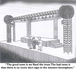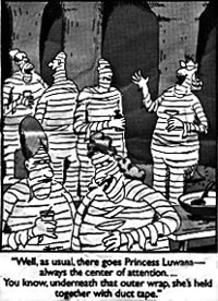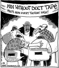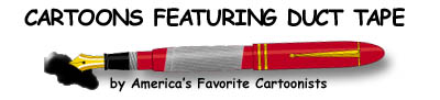 There is definitely humor in duct tape (our bestselling Duct Tape Books attest to that). Do you have a duct tape cartoon that you would like us to post? Email an electronic file to us, or mail the cartoon and we will scan it for you. click here for our submission info. Please credit the artist if not immediately identifyable on the cartoon. Thanks! - The Duct Tape Guys
