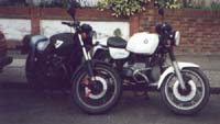 Stefans black bike (left, a1983 Suzuki Katana 550) used to have a plain black seat cover which let in water so he made the two-tone silver & black one out of duck tape. The Katana 750 and 1100 models used to come with 2-tone seats in these colors so it was pretty much an obvious color choice. --- Stefan