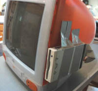 The new iMacs don't come with a built-in disc drive (since discs are apparently going the way of the 8-track tapes). So, Matt M. of Shoreview, MN took matters into his own hands and created his own built-in disc reader. Good thinking, Matt!