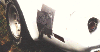 Debbie Brown got a nasty hole in the side of her beautiful white Corvette. Recognizing that duct tape is body shop on a roll, Debbie made this repair and labeled it appropriately, OUCH!
