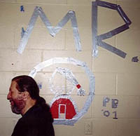 Portrait on a R"O"ll. My science teacher, Mr. Ogonowski (photo left), always keeps a roll of duct tape on his desk for doing many diffrent things with. Although Mr. O is always trying to help his student's grades, sitting me in front on multiple rolls was not the wisest decision. In an effort to show him how much I appreciated his work, I created a mural of his likeness on one of the science walls. This took me two class periods and three afterschool visits to complete. It looks jsut like him, as you can see. --- Philip B., Smithtown, New York