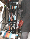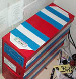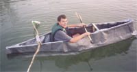 (left) Kyle M. of Huntsville, AL, made this nifty canoe out of a wood framework covered with duct tape (apparently the birch bark of the new millennium). He added the pop bottle outriggers to avoid tipping. Good work, Kyle!