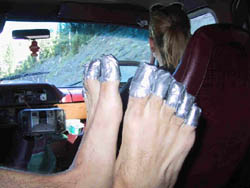 Actually this photo was taken before starting Hood to Coast Relay. Hood To Coast Relay is the largest relay race in North America, its stretches 195 miles from the top of Oregon's Mt. Hood, down to the Pacific Ocean, in Seaside, Oregon, over 12,000 runners show up to experience this annual event, now in it's 21th year. What you see is our first runner after duct taping his toes to prevent blisters. All new to me. I wouldn't believe it if I hadn't seen it with my own eyes. So I photo'd it. And it worked too. I didn't use duct tape and I got blisters. :^( So, lesson learned, need to prevent chafing of nips or pits, or blisters on the feet, I guess you just have to duct tape it. Pretty kewl huh! :^) --- Kevin