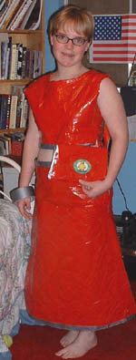 This is a picture of me in a duct tape dress and skirt (the skirt is 100% duct tape, the top has a cloth base). I will be wearing this to winter ball. You can also see my matching duct tape purse and duct tape. See our other duct tape fashions here. --- Sarah Van H., Poway, Ca