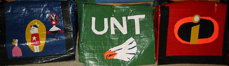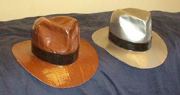 ![]() Raiders of the Lost Tape Fedora (left) Kevin M. of Belmont, CA fashioned these 100% duct tape fedors (Okay, there is a little cardboard in the brim... but we won't mention that - oops, too late!) (below) Brad R. made these color, themed backpacks: Homestar, University of North Texas and the Incredibles. The packs are functional and durable (not to mention eye-catching). |