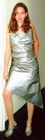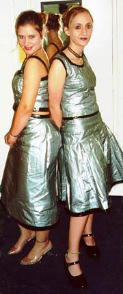 | Duct Tape Coeds We created these dresses for the 2000 Freshman Formal Dance at our college and received several interesting reactions amidst the formally dressed crowd, from the ducttape fanatics, to those awed by the idea of an all-tape dress, to those snobby in their disbelief that anyone would do something so horrendous as to arrive at a formal in material from a hardware store. Heather (blonde) and Allie (darker hair) are both in black trimmed dresses, and I'm (Katy) the one in the other dress with small washers and fishing shot dangling from the hem as fringe. --- Katy |