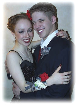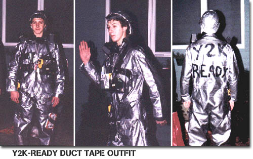 | Why is this couple smiling? (right) Because they just saved over $30 on boutonniere and corsage by making the boutonniere totally out of duct tape and the corsage out of duct tape and artificial flowers. Not only is this a subtle fashion statement and a scoff at the prices that florists charge these days, they’ll also last forever! Nice going, Jana and Michael! Y2K Duct Tape Guy: |