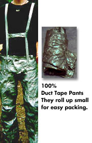 | Edward’s Duct Tape Pants Edward made these 100% Duct Tape Pants while at summer at camp. They took 1 hour and three rolls of duct tape.. for a price of $15 Canadian... not bad for a pair of pants that never looks bad when patched. And, you can always alter and adjust them anywhere, anytime! Check out Edward's clean joke site (we like to support clean humor). |