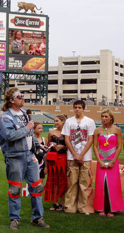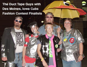 |  | Iowa Cubs (Des Moines) Salute to Duck Tape Night (above from left) Tim gets the crowds' votes for Kevin, Jim introduces Audrey (the ultimate winner) who make an I-Cubs Jersey out of duct tape. Dick made a classy tie out of X-Treme Duck Tape. (left) The three finalists, Kevin, Chris, and winner Audrey (she won a color TV and 25 luxury box seat tickets). (right) The happy winner of the duct tape "Cubby" mascot sculpture made by Canadian Duct Tape Sculptor, Todd Scott. Tape Me Out to the Ballgame Night with the Detroit Tigers |  | ||||||||
