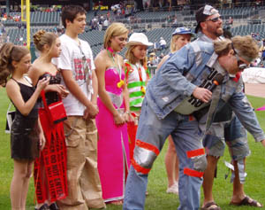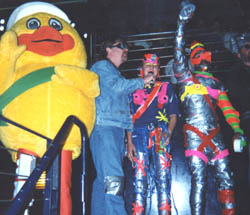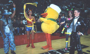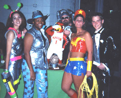 | Atlanta Hawks Game (left) These were the two winners of the non-college impromptu division at the March 2001 Atlanta Hawks game. Both created their fashions at the show and each won a Phillips DVD player. Below are the three winners of the college division at the same game. The guy in the tux won $1000 - two runners up won $500 each (presumably for college expenses). | ||||||||||