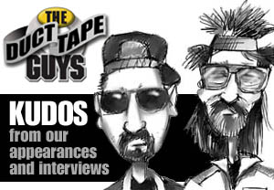 "Thank you. You guys were awesome and saved the show." "The Duct Tape Guys are hysterical! We laughed so hard, phlegm came up!" "You guys are GIANTS! Industrial Strength!? The Central Washington Home Builders Association would highly recommend the Duct Tape Guys for your show. They were extremely professional and willing to help with all media. They also brought the traffic into the show like no other performer we have had that cost way more than their reasonable fee. The bang for the buck was definitely there for us. You [Tim] and Jim really helped get our dealers off to a great start Sunday morning. The Duct Tape Guys drew the biggest group we've ever had for a breakfast meeting at the market [over 800]. We heard from many of our dealers how much they enjoyed being entertained at that time of the day. Thank you for getting up so early to be part of our program. Hopefully, we'll have an opportunity to work together again. "You guys are the biggest crowd draw of our shows!" - Rob Lynch, President of Orchard Supply Hardware in reference to The Duct Tape Guys' appearances at their "How To Fairs" (the other regular performers are celebrities from PBS, HGTV, and various television and radio shows). I'm sure you've been told this: Very funny, very good. And yeah, we'd be interested in having you back." - Bob Madden, KATY "Duct Tape Tim, the Toolman Taylor, Carrot Top and Bob and Doug McKenzie together and you have The Duct Tape Guys" - Kevin Barnes, KBEM fm, Minneapolis, MN "Possibly the thinnest premise for a show we ever had and it went on for hours! Great fun!" "Wow! Thank YOU!! You are a great interview! We hope to talk with you again soon!" "These guys are charming!" "Thanks a ton for being on our show!!! We had a great time with you and would love to have you on again. Please put us on your distribution list so we can keep in touch about what you guys have going on! Thanks!" - Obadiah, RadioU "Having you [the Duct Tape Guys] in our studio was our pleasure, believe me! In fact, I was just trying to remember who we've had on the show twice besides you guys -- you may be it!" - Kurt V. - Producer, the Kathy and Judy Show, WGN, Chicago Thanks for taking time out for us this morning! You were fantastic! We had several calls afterwards. We look forward to being able to use you in the future. I am ALWAYS looking for good clean humor since we are a family-based country show. Thanks again Tim! "Their deadpan humor was a hit with the listeners and the positive e-mail keeps piling up!" "We though you were great! We'd love to have you back!" - 105.1fm The Groove, Detroit, MI "There is an interesting cultural movement on duct tape in the US. People are using it for far more than just repairs. The Duct Tape Guys have a strong following. Any time the media (TV, radio, print..) is looking for a person to interview on the subject, The Duct Tape Guys are first on the interview list. " "We've never had so many callers on ANY topic. The phone rang for three days!" "The best guest I've ever had." - Steve Winzenberg, WHO Radio Thank you so much, you both were a pleasure to work with. I will pass the word onto other [HBA] Associations. I think everyone that attended the shows left with a smile on their face. "You were a big hit here in Idaho when you were on our show last. For weeks we got comments about "that Duct Tape Guy". Most were even favorable!" "You guys are as funny as Penn and Teller! No wait... YOU’RE FUNNIER!" "You’ve got to be our favorite guest ever!" "Hey, Tim, it was great having you on today!!!!! I got about eight hours notice you would be on, and was assured you would be a great guest... and it was true! Many thanks, and I look forward to talking with you again. I got a lot of good feedback on your appearance today, and I laughed my ass off - sincerely! Tim and Jim were real professionals. Working with our P.R. agency, they had a full slate of media interviews. Walking through the lobby before the show you could hear the crowd talking about their interviews. Great job! - Sherry Larsen, American Shows (Sacramento, CA) We received $2 to $3 in media for every $1 we spent on the Duct Tape Guys. We HIGHLY RECOMMEND them. We were delighted to have you here. I will put the word out to the National and our State [HBA] Association. You were just great to work with. Again, thank you!!! - Tommie Sprague, HBA of Lenawee County, Michigan Having the Duct Tape Guys perform at our home show was a pleasure! Their spirit of cooperation and their willingness to be accessible made our show fun for our visitors and especially our staff. We plan to bring them back in the near future! Great guys! - Builder’s Association of Erie Pennsylvania Thanks so much for all your hard work and humor. You guys made our home show a terriffic success. Everybody enjoyed your act and is very interested in having you back next year in a larger venue! - Jake Loyer, MIS Director The Duct Tape Guys are easy to work with. We booked the act very late. With greater lead time we feel this could definitely be a draw for male attendees. We will hire them again. The hardware industry can’t go wrong with these guys! They know hardware and they know how to have a good time! [Our client] called to say how much he appreciated the effort from you guys and truly how pleased he was with the impact you made throughout the day. We LOVE you guys! The Duct Tape Guys outdrew all of our other stage events by a substantial margin. They’re comin’ back! "You and Jim are delightful to work with! I've been singing your praises here at our office all morning! Not at all surprised you heard directly from WANE-TV! - they loved you!!! (As did WAIJ, WLDE, and Around Fort Wayne...). We definitely will recommend you!" - Sally Bonneau, Vice President & Director of Public Relations, BPS Marketing, Inc., Indianapolis, IN TO BOOK THE GUYS TO ENTERTAIN AT YOUR EVENT: Contact our agent (also named Tim) at 612-240-6679 Speaking of Corporate Events... To Whom It
