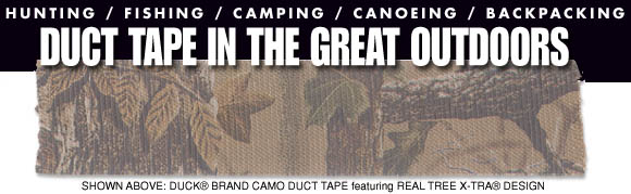 Although Trust E. Duck, the Duck® brand mascot (left) may not approve of the DUCK hunting hints listed below, he sure approves of the use of Duck® brand duct tape for outdoor activities like hunting (deer), fishing, hiking, and camping. The hints below just scratch the surface of all of the real (and wacky) ways that duct tape can be used outdoors. Read through this list and feel free to email us your additional ideas. Remember: Never leave home without duct tape! Click the tape strip above to get more information about Duck® brand Camouflage Duct Tapes.
