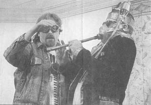 Here Jim and Tim demonstrate how an ordinary toilet plunger, duct taped to your face, gives you an extra "hand" to hold those spring-loaded faucets in the "on" position while allowing you to put both hands under the running water. (The gizmo on Jims head is a nighttime jogging hydration device.) Photo by Ana Venegas, The Orange County Register.