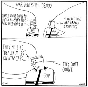 Recent polling (ABC/Washington Post poll, 3/16/05) indicates that the vast majority of the American public believes that U.S. casualties in Iraq are unacceptable. One can only wonder what Americans think about the level of Iraqi civilian casualties; unfortunately, the media's count dramatically minimizes that death toll.